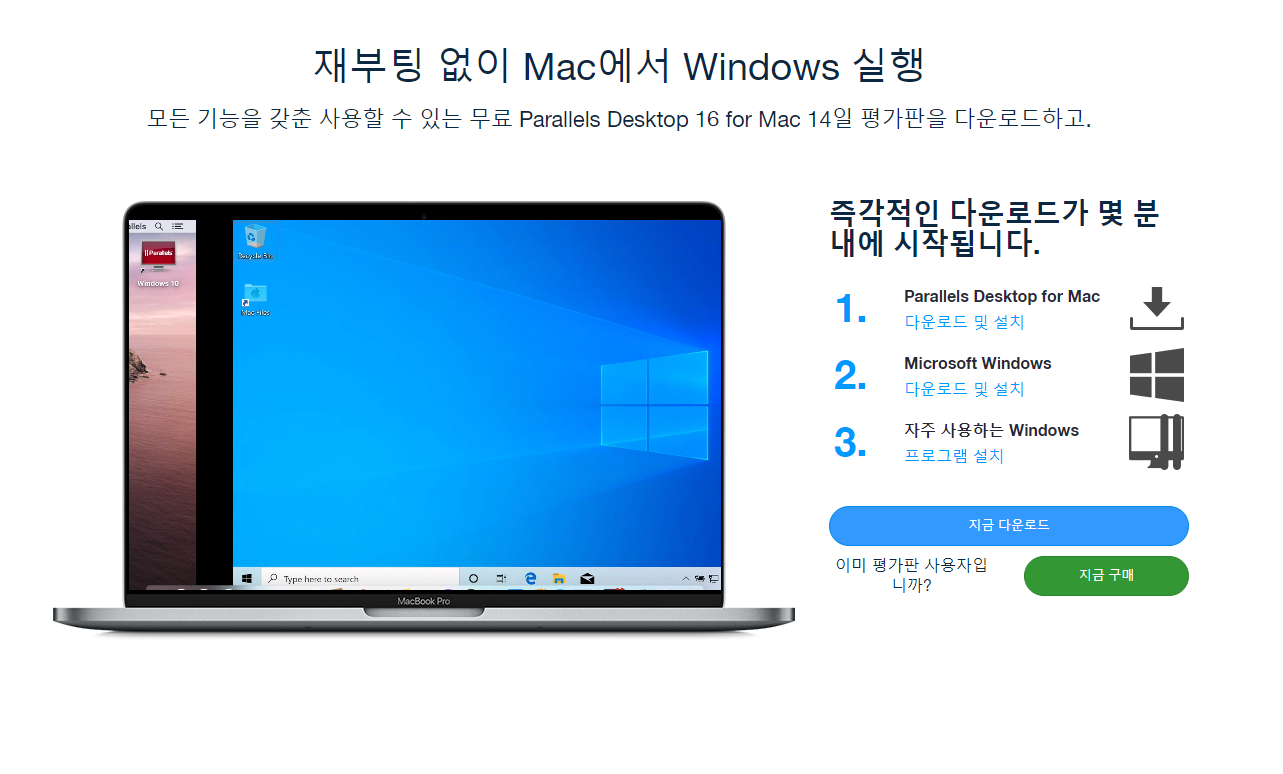 그렇다면 어떻게 해야 M1칩이 탑재된 맥북에어에 윈도우를 설치할 수 있을까요? 바로 페러렐즈(Parallels)를 통해서 설치할 수 있습니다. 페러렐즈는 가상화 프로그램으로 VMWare 또는 VitualBox와 같은 것으로 여기면 됩니다. 맥 os를 사용하면서도 윈도우 가상 머신을 만들어 윈도우도 사용하게 해주는 프로그램이라 이해하면 됩니다.